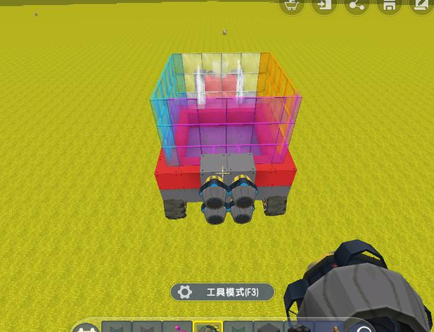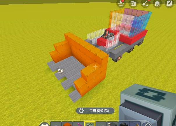 第四步在车头前面建造一个推土机的铲子 ,种地、使用橙色的方块在车头处建造,在驾驶座椅的后面使用彩色的透明玻璃制作出一个超大的装载容器 ,
